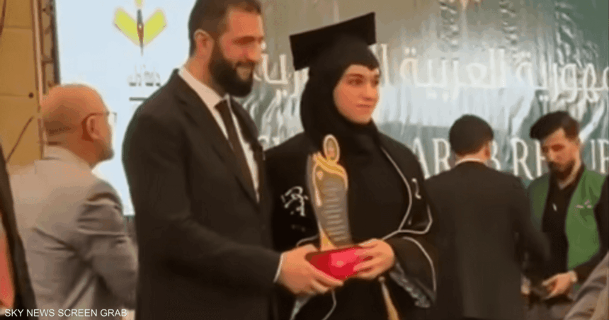 وظهر الشرع في الحفل يكرم الطلبة الخريجين ومن بينهم زوجته لطيفة، حيث جمعتها على منصة التكريم صورة تذكارية.