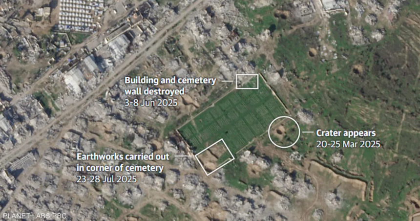 ووفق صحيفة “غارديان” البريطانية، تكشف الصور الملتقطة للمقبرة الواقعة في حي التفاح بمدينة غزة، عن عمليات حفر وتسوية واسعة النطاق في الزاوية الجنوبية الغربية للموقع.